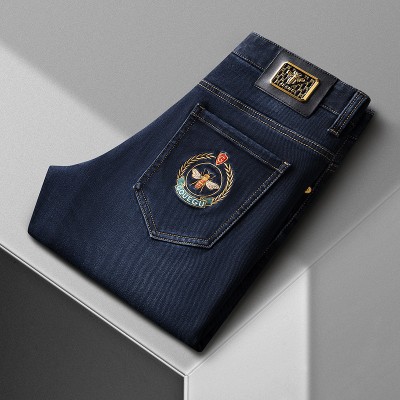 Winter Plus Velvet Thickened Men's Trousers Light Luxury Business Denim Fashion Embroidery Elastic Slim Straight Pants